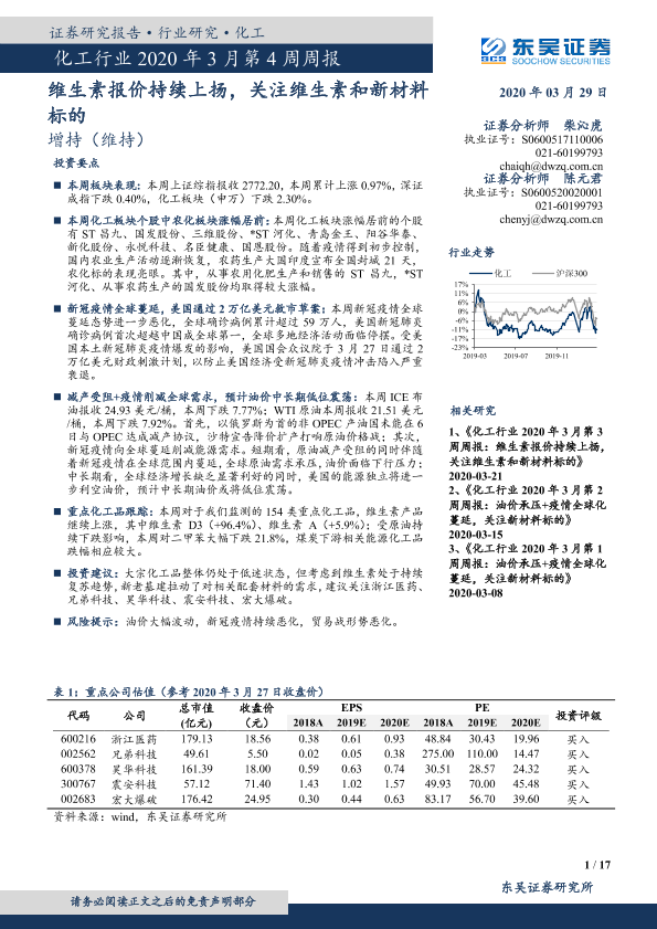 【东吴证券】【20200329】化工行业2020年3月第4周周报:维生素报价持续上扬,关注维生素和新材料标的-17页