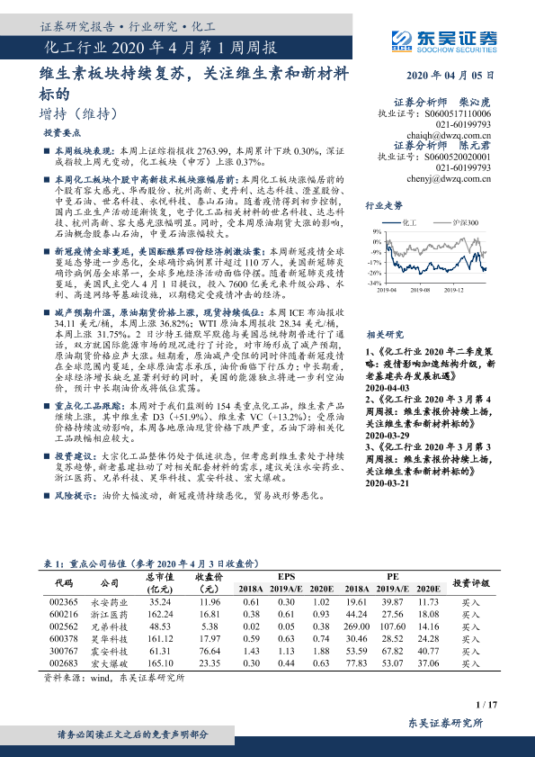 【东吴证券】【20200405】化工行业2020年4月第1周周报:维生素板块持续复苏,关注维生素和新材料标的-17页