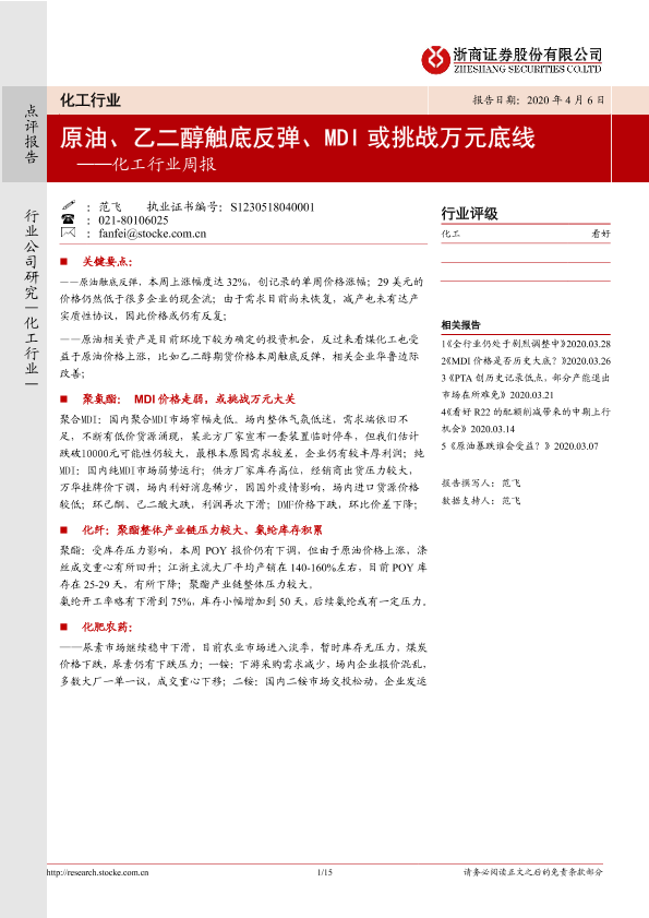 【浙商证券】【20200406】20200406-浙商证券-化工行业周报:原油、乙二醇触底反弹、MDI或挑战万元底线-15页