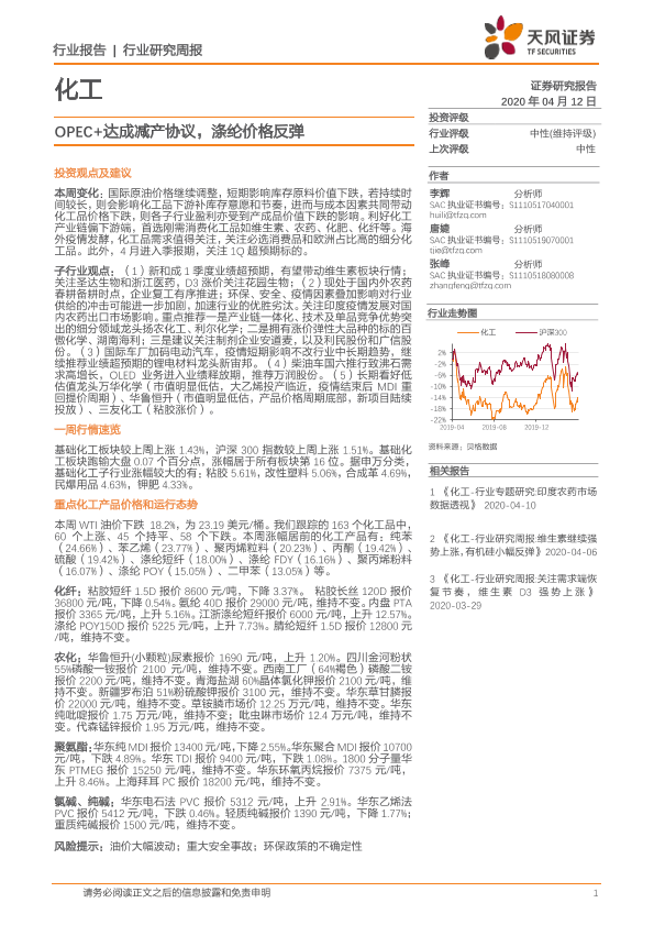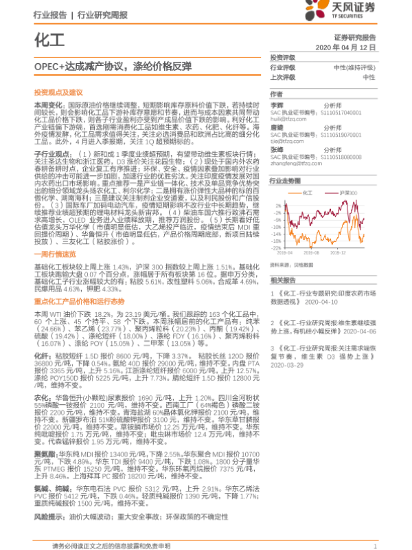 【天风证券】【20200412】20200412-天风证券-化工行业研究周报:OPEC+达成减产协议,涤纶价格反弹-15页