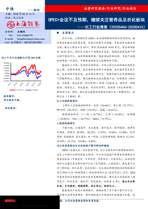 【上海证券】【20200414】20200414-上海证券-化工行业周报:OPEC+会议不及预期,继续关注营养品及农化板块-18页