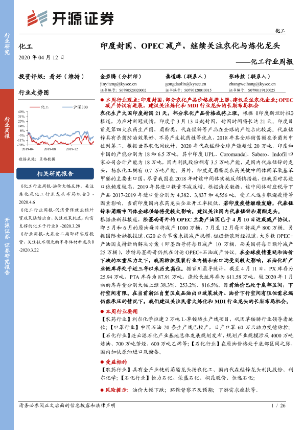 【开源证券】【20200412】20200412-开源证券-化工行业周报:印度封国、OPEC减产,继续关注农化与炼化龙头-26页