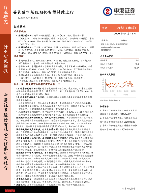 【申港证券】【20200413】20200413-申港证券-基础化工行业周报:蛋氨酸市场短期仍有望持续上行-20页