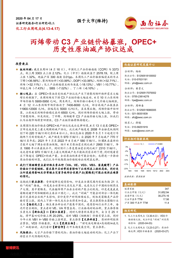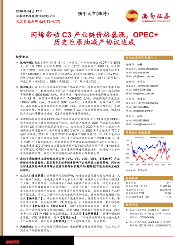 【西南证券】【20200417】20200417-西南证券-化工行业周观点:丙烯带动C3产业链价格暴涨,OPEC+历史性原油减产协议达成-9页