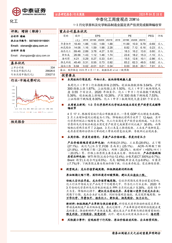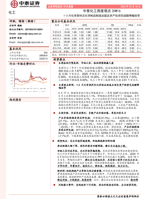 【中泰证券】【20200418】中泰化工周度观点20W16:1-3月化学原料及化学制品制造业固定资产投资完成额降幅收窄-25页