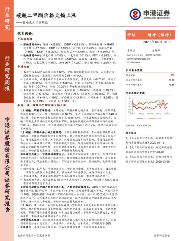 【申港证券】【20200420】基础化工行业周报:碳酸二甲酯价格大幅上涨-19页