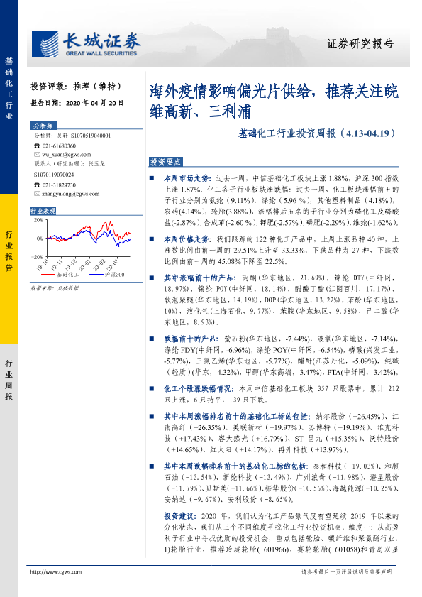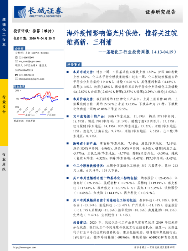 【长城证券】【20200420】20200420-长城证券-基础化工行业投资周报:海外疫情影响偏光片供给,推荐关注皖维高新、三利浦-26页