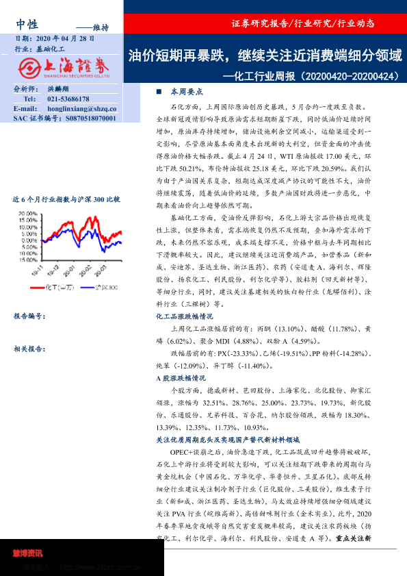 【上海证券】【20200428】20200428-上海证券-化工行业周报:油价短期再暴跌,继续关注近消费端细分领域-19页