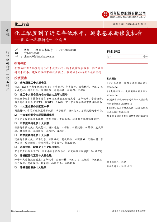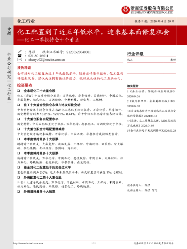 【浙商证券】【20200429】化工一季报持仓十个看点:化工配置到了近五年低水平,迎来基本面修复机会-11页