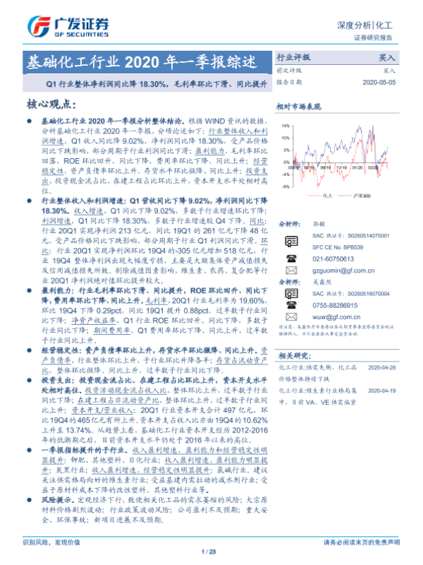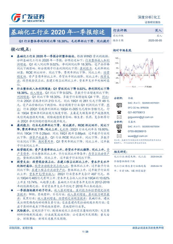 【广发证券】【20200505】基础化工行业2020年一季报综述:Q1行业整体净利润同比降18.30%,毛利率环比下滑、同比提升-23页