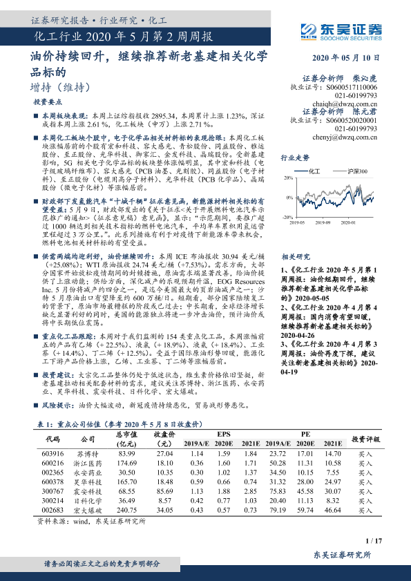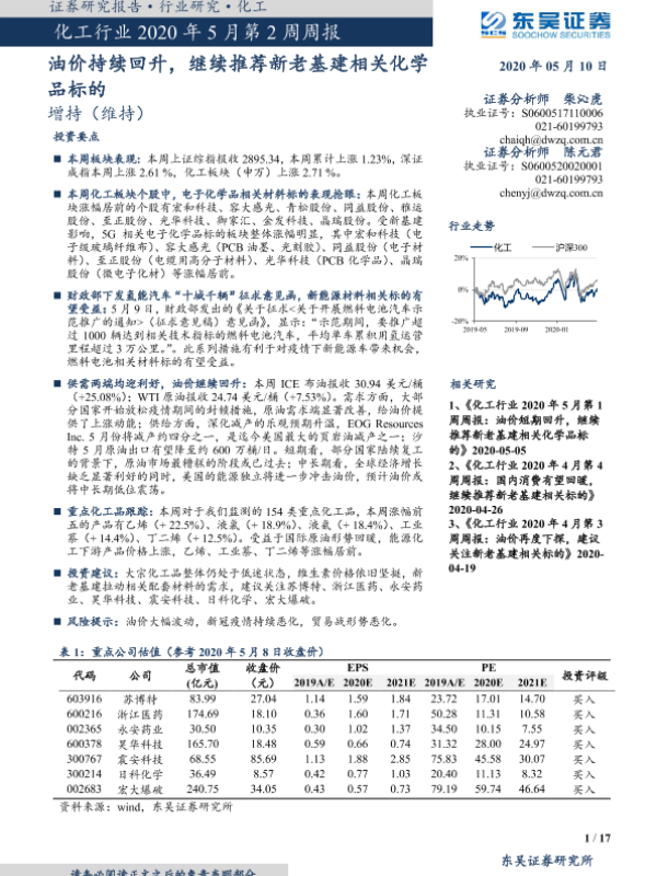 【东吴证券】【20200510】化工行业2020年5月第2周周报:油价持续回升,继续推荐新老基建相关化学品标的-17页