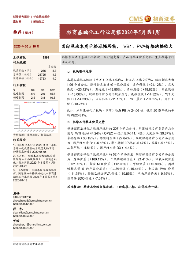 【海通证券】【20200510】招商基础化工行业周报2020年5月第1周:国际原油本周价格涨幅居前,VB1、PVA价格跌幅较大-16页