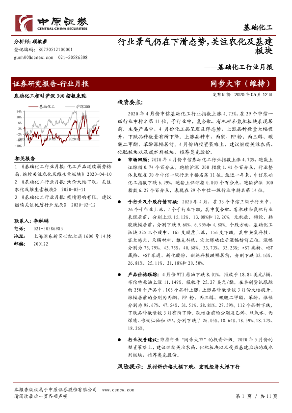 【中原证券】【20200512】基础化工行业月报:行业景气仍在下滑态势,关注农化及基建板块-11页