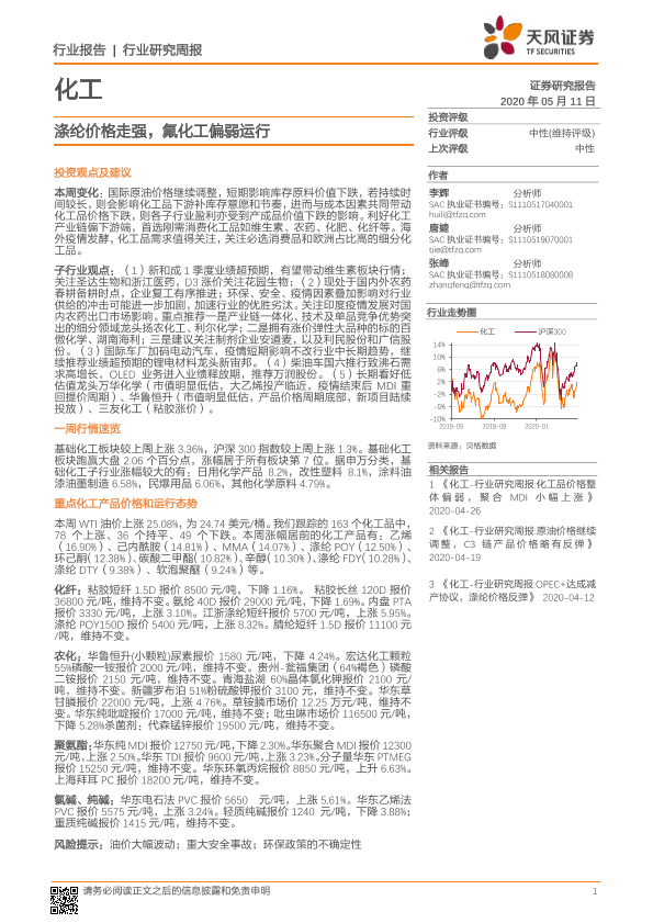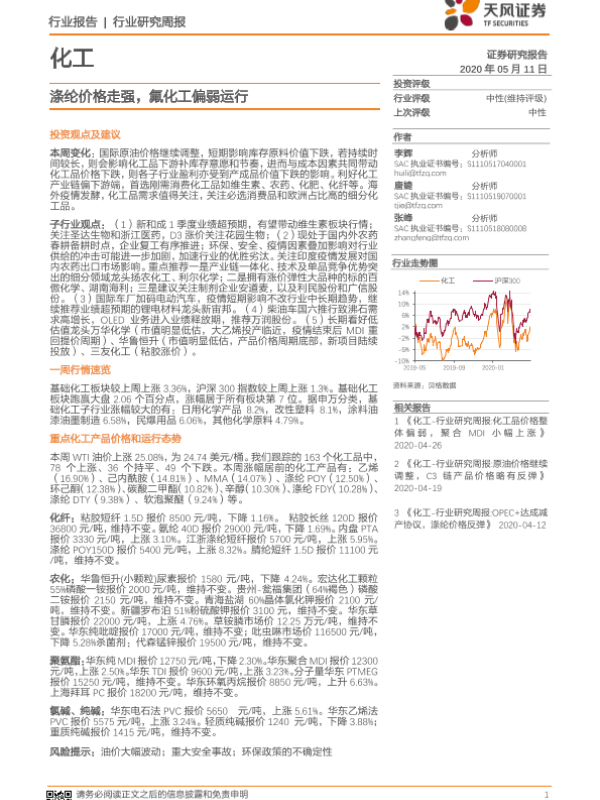 【天风证券】【20200511】20200511-天风证券-化工行业研究周报:涤纶价格走强,氟化工偏弱运行-16页