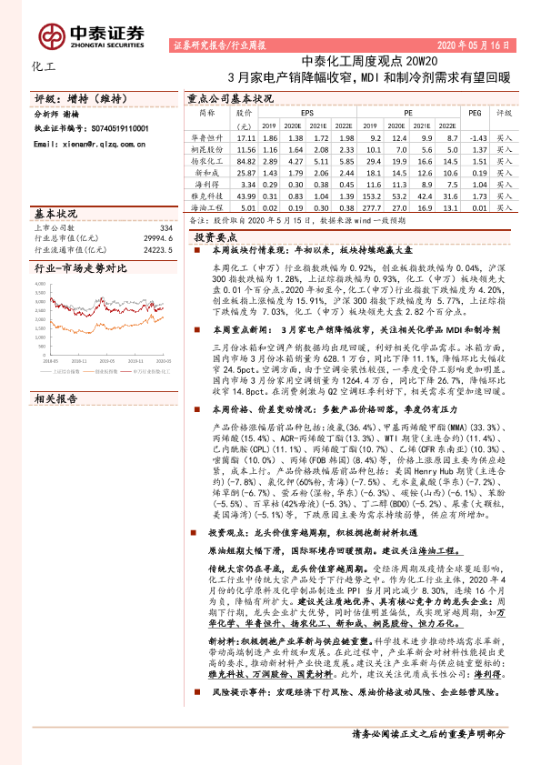 【中泰证券】【20200516】中泰化工周度观点20W20:3月家电产销降幅收窄,MDI和制冷剂需求有望回暖-24页