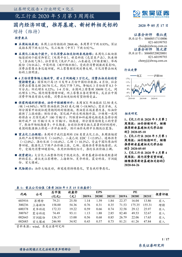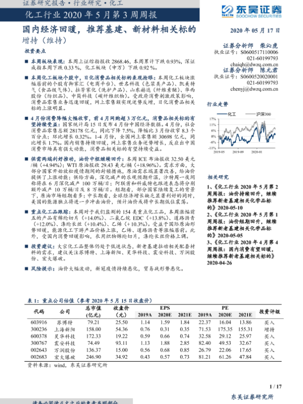 【东吴证券】【20200517】化工行业2020年5月第3周周报:国内经济回暖,推荐基建、新材料相关标的-17页