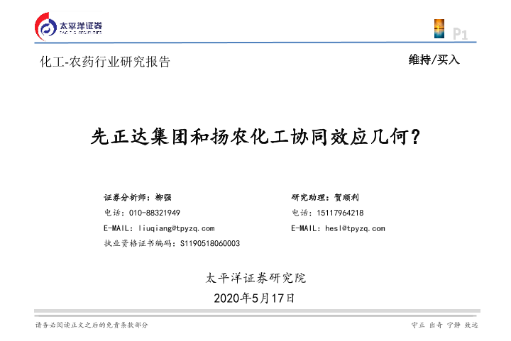 【太平洋证券】【20200517】20200517-太平洋-化工-农药行业研究报告:先正达集团和扬农化工协同效应几何?-17页