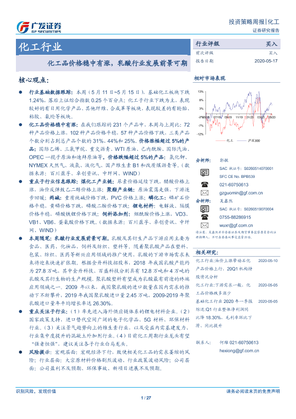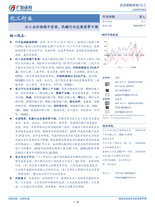 【广发证券】【20200517】20200517-广发证券-化工行业投资策略周报:化工品价格稳中有涨,乳酸行业发展前景可期-27页