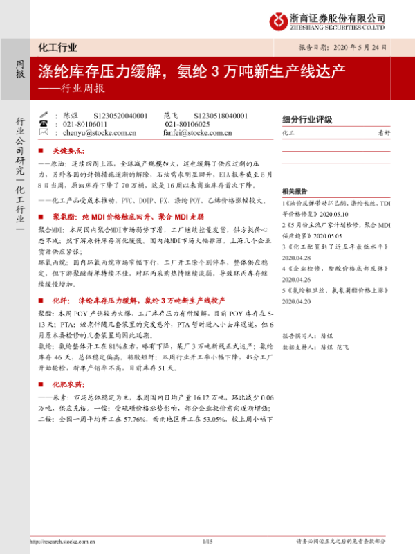 【浙商证券】【20200524】20200524-浙商证券-化工行业周报:涤纶库存压力缓解,氨纶3万吨新生产线达产-15页