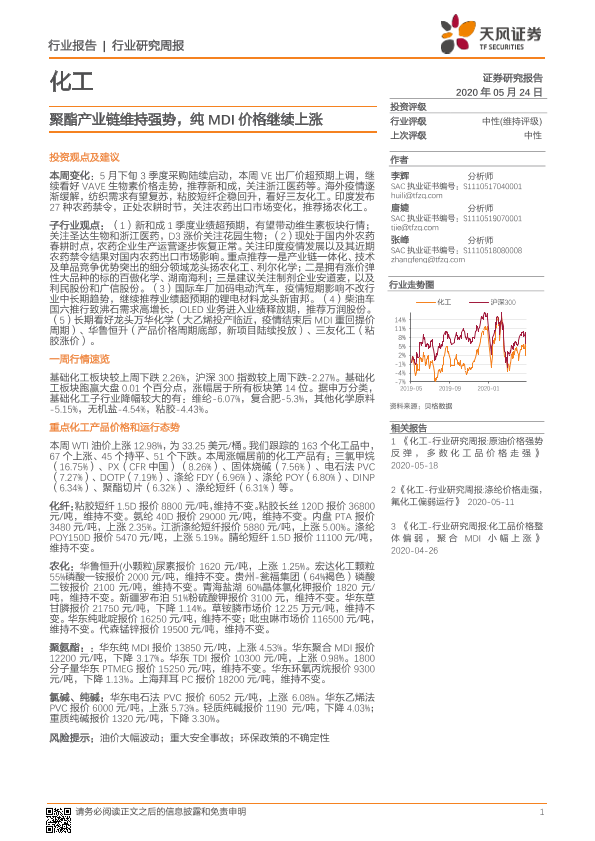 【天风证券】【20200524】20200524-天风证券-化工行业研究周报:聚酯产业链维持强势,纯MDI价格继续上涨-15页