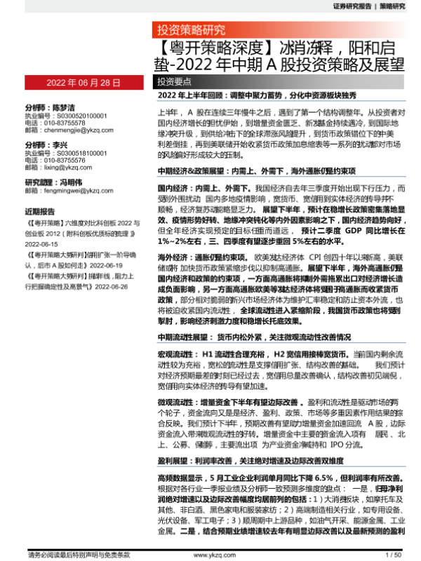 【粤开证券】【20220628】2022年中期A股投资策略及展望:冰消冻释,阳和启蛰-50页