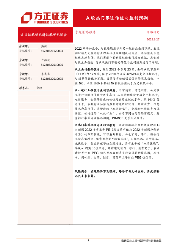 【方正证券】【20220627】专题策略报告:A股热门赛道估值与盈利预期-20页