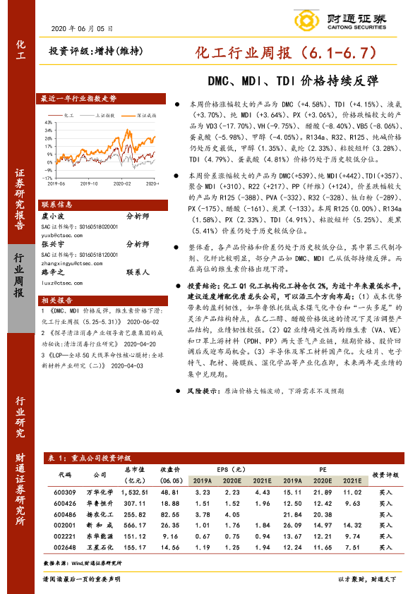 【财通证券】【20200605】20200605-财通证券-化工行业周报:DMC、MDI、TDI价格持续反弹-6页