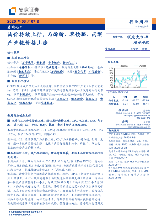 【安信证券】【20200607】基础化工行业周报:油价持续上行,丙烯腈、草铵膦、丙酮产业链价格上涨-5页