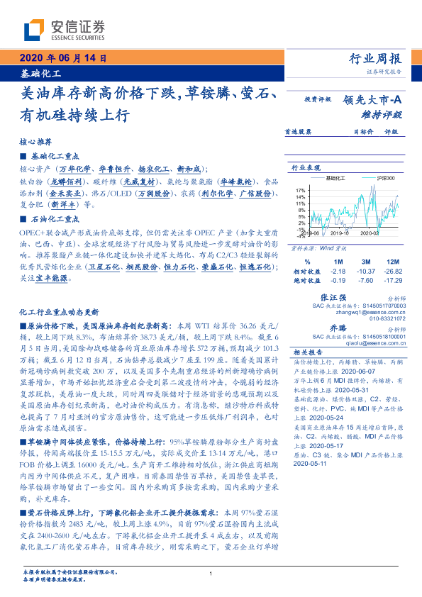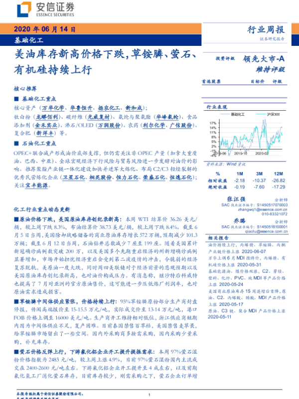 【安信证券】【20200614】基础化工行业周报:美油库存新高价格下跌,草铵膦、萤石、有机硅持续上行-4页