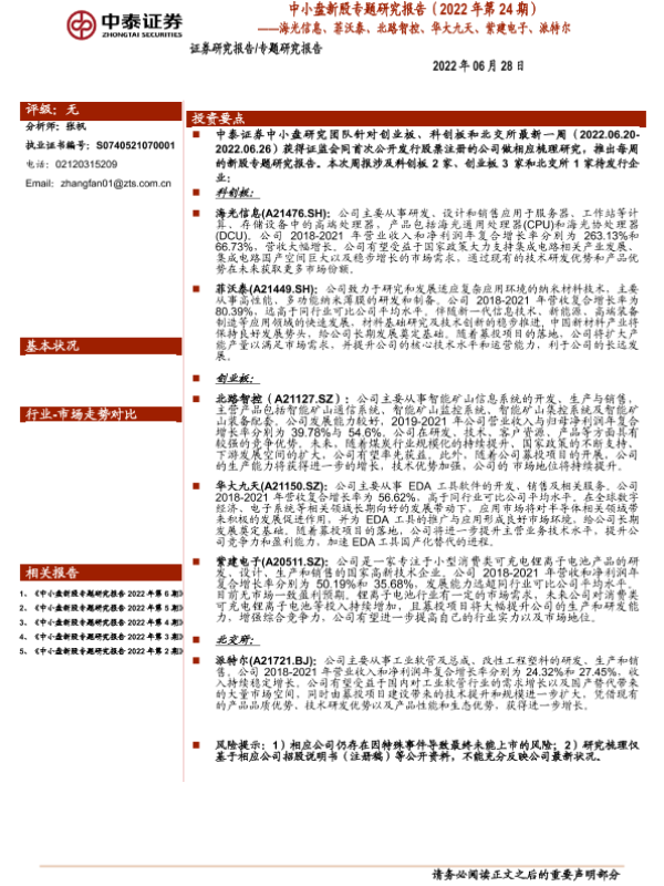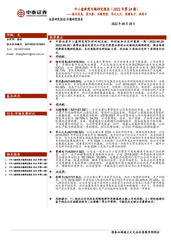 【中泰证券】【20220628】中小盘新股专题研究报告(2022年第24期):海光信息、菲沃泰、北路智控、华大九天、紫建电子、派特尔-34页