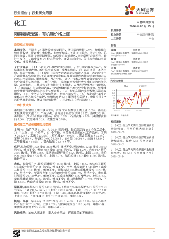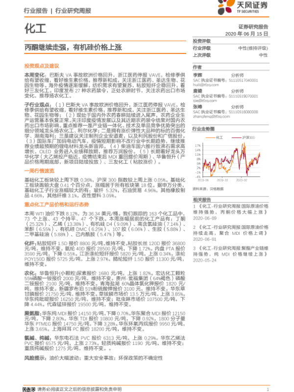 【天风证券】【20200615】20200615-天风证券-化工行业研究周报:丙酮继续走强,有机硅价格上涨-16页
