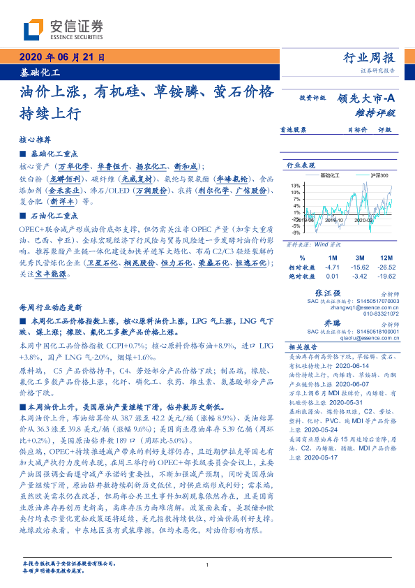【安信证券】【20200621】基础化工行业周报:油价上涨,有机硅、草铵膦、萤石价格持续上行-4页