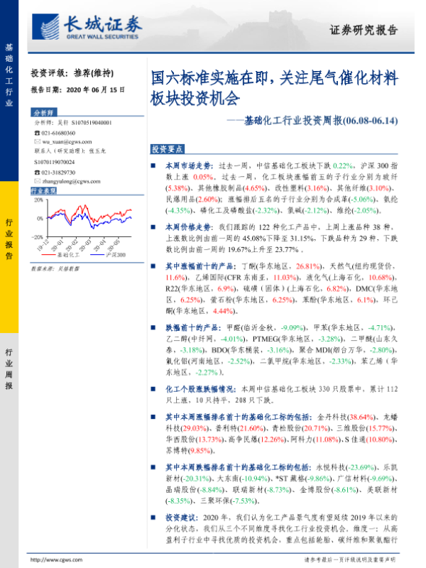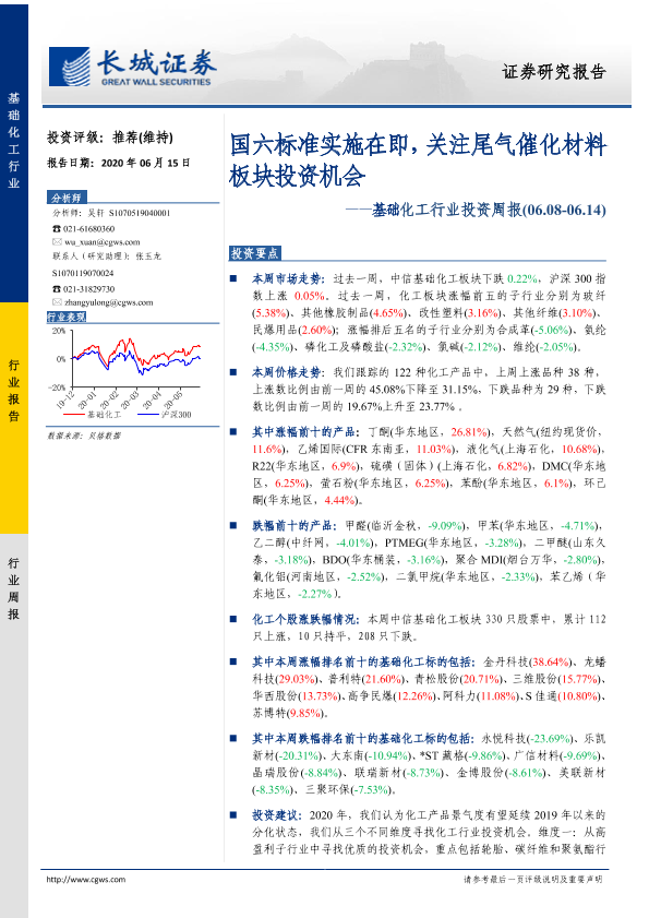 【长城证券】【20200615】20200615-长城证券-基础化工行业投资周报:国六标准实施在即,关注尾气催化材料板块投资机会-27页