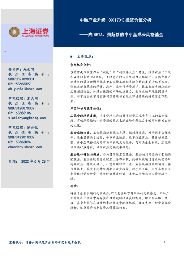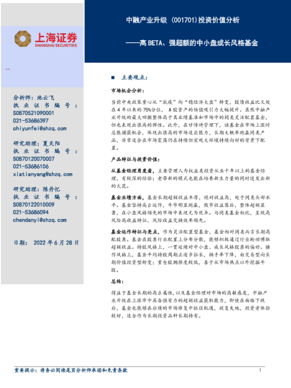 【上海证券】【20220628】中融产业升级 (001701)投资价值分析:高BETA、强超额的中小盘成长风格基金-19页