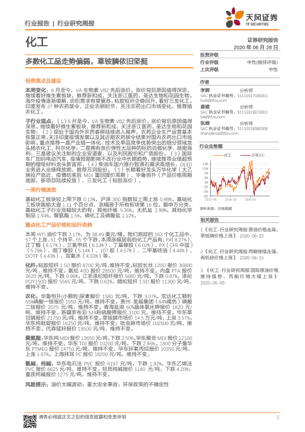 【天风证券】【20200628】20200628-天风证券-化工行业研究周报:多数化工品走势偏弱,草铵膦依旧坚挺-16页