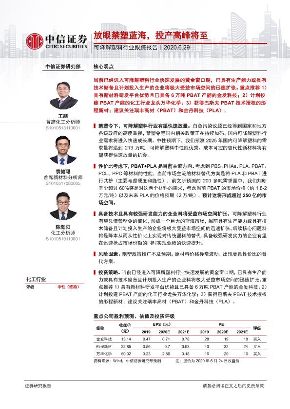 【中信证券】【20200629】20200629-中信证券-化工-可降解塑料行业跟踪报告:放眼禁塑蓝海,投产高峰将至-10页