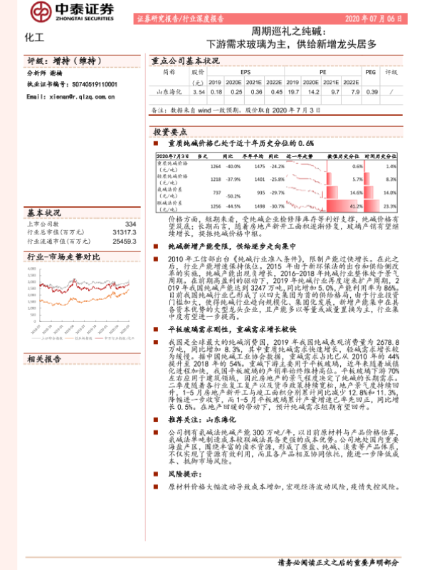 【中泰证券】【20200706】周期巡礼之纯碱:下游需求玻璃为主,供给新增龙头居多-20页