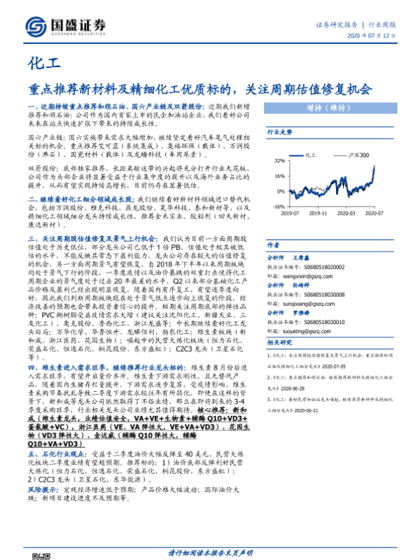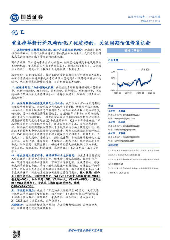 【国盛证券】【20200712】20200712-国盛证券-化工行业周报:重点推荐新材料及精细化工优质标的,关注周期估值修复机会-8页
