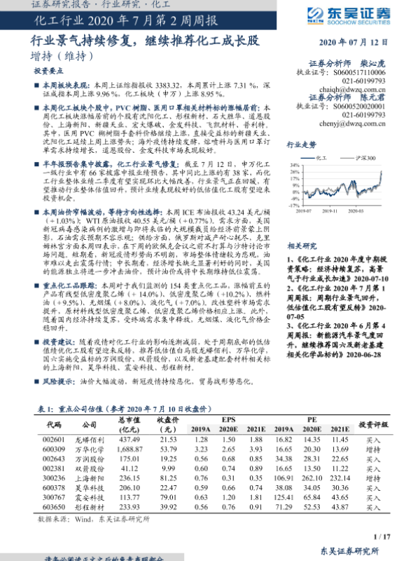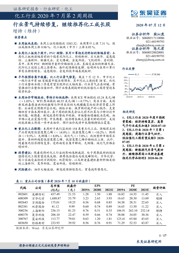 【东吴证券】【20200712】化工行业2020年7月第2周周报:行业景气持续修复,继续推荐化工成长股-17页