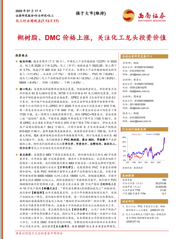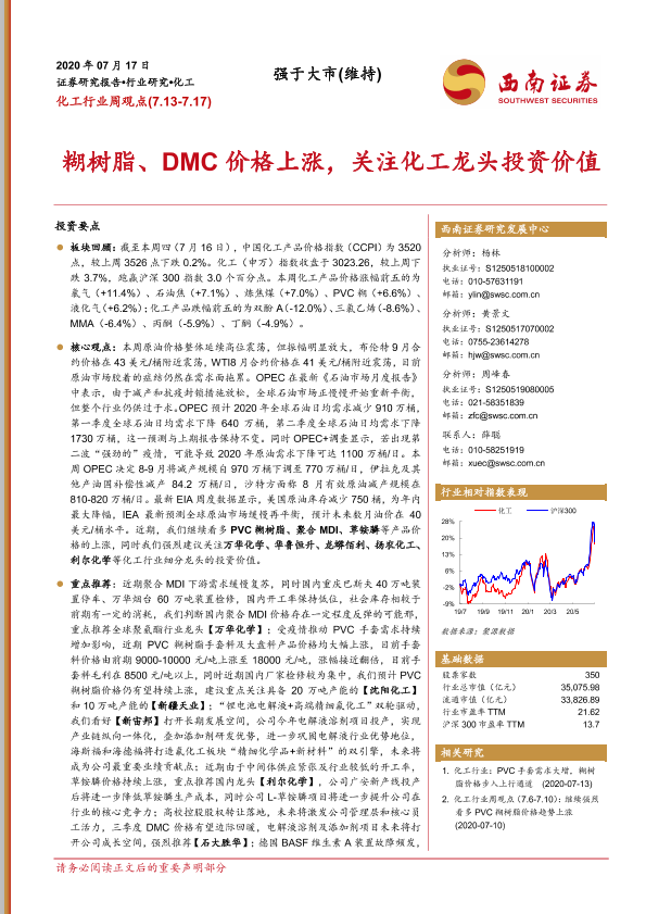 【西南证券】【20200717】20200717-西南证券-化工行业周观点:糊树脂、DMC价格上涨,关注化工龙头投资价值-10页