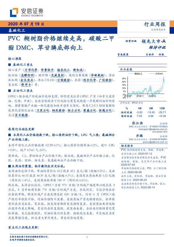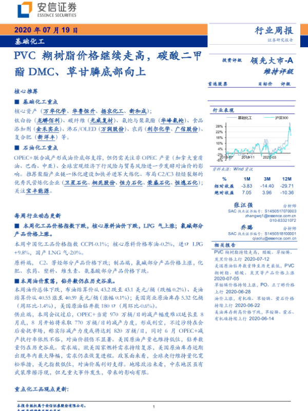 【安信证券】【20200719】基础化工行业周报:PVC糊树脂价格继续走高,碳酸二甲酯DMC、草甘膦底部向上-4页
