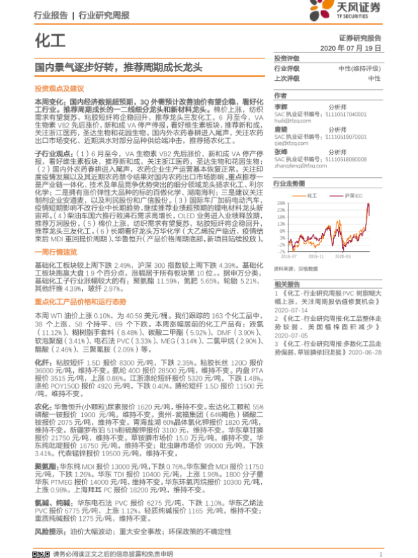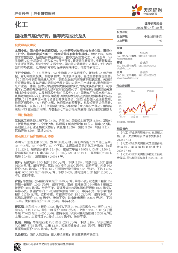 【天风证券】【20200719】20200719-天风证券-化工行业研究周报:国内景气逐步好转,推荐周期成长龙头-15页