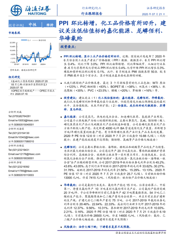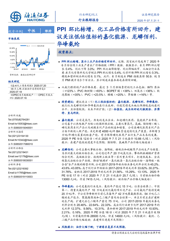 【海通证券】【20200721】20200721-海通证券-化工:PPI环比转增,化工品价格有所回升,建议关注低估值标的嘉化能源、龙蟒佰利、华峰氨纶-2页