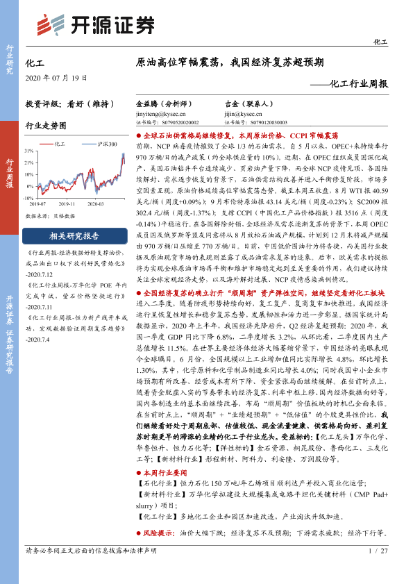 【开源证券】【20200719】20200719-开源证券-化工行业周报:原油高位窄幅震荡,我国经济复苏超预期-27页