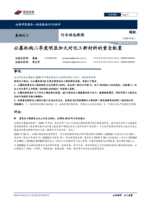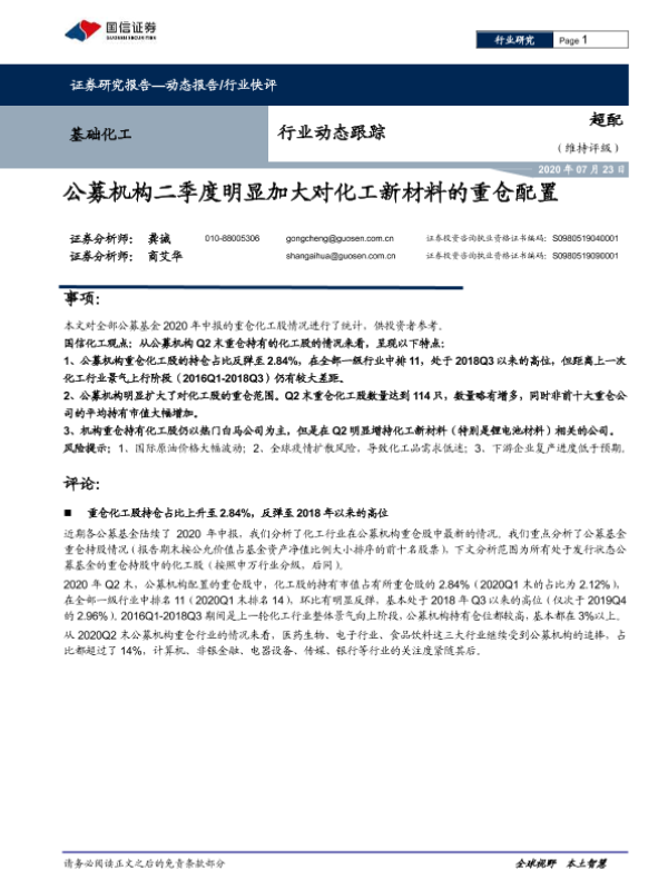 【国信证券】【20200723】基础化工行业动态跟踪:公募机构二季度明显加大对化工新材料的重仓配置-7页
