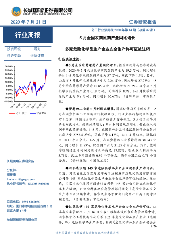 【长城国瑞证券】【20200721】化工行业双周报2020年第14期(总第39期):5月全国农药原药产量同比增长 多家危险化学品生产企业安全生产许可证被注销-20页