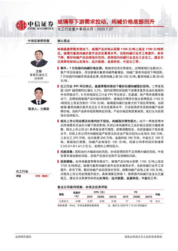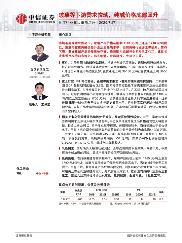 【中信证券】【20200727】20200727-中信证券-化工行业重大事项点评:玻璃等下游需求拉动,纯碱价格底部回升-4页