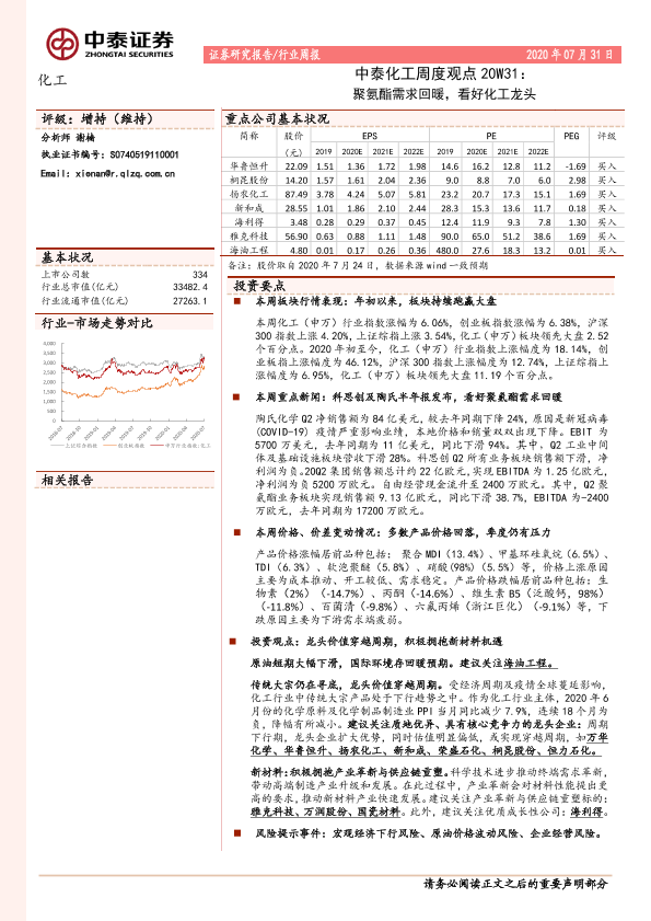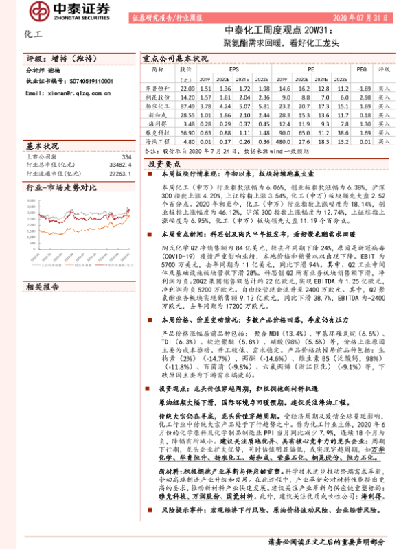 【中泰证券】【20200731】中泰化工周度观点20W31:聚氨酯需求回暖,看好化工龙头-27页