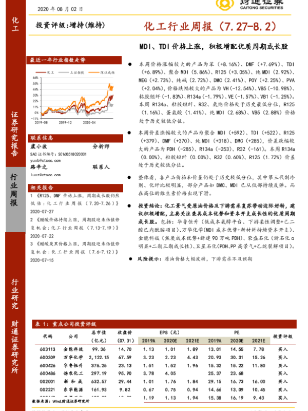 【财通证券】【20200802】20200802-财通证券-化工行业周报:MDI、TDI价格上涨,积极增配优质周期成长股-6页