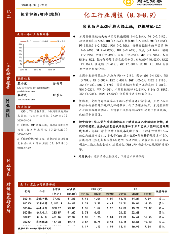 【财通证券】【20200809】20200809-财通证券-化工行业周报:聚氨酯产业链价格大幅上涨,积极增配化工-6页